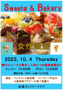 【女性限定】スイーツ&ベーカリーコンペ★10月4日(火) 2022年9月19日 女性限定の知る人ぞ知る人気コンペ『スイーツ&ベーカリーOP』 今年もケーキの食べ放題で楽しんじゃおう♪ 巷で話題のスイーツが勢ぞろい(^^)/