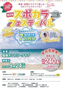 第2回スポカラコンペ!【組合せ表】 2018年8月16日 9 月24日(祝) スポカラフェスティバル組合せ・スタート時間の確認はこちらから! ↓ ↓ ↓ ↓ ↓ ↓ スポカラフェスティバル組合せ 今からでもエントリー受付中! 第2回スポカラフェスティバル開催! 優勝賞金は7万円分の旅行券!! その他超豪華な賞品を用意してお待ちしております。 プレー代 11,000円(食事付) 参加費 3,000円 競技方法 前半9ホール新ペリア方式 詳細はお気軽に塩嶺カントリークラブまでお問い合わせください。