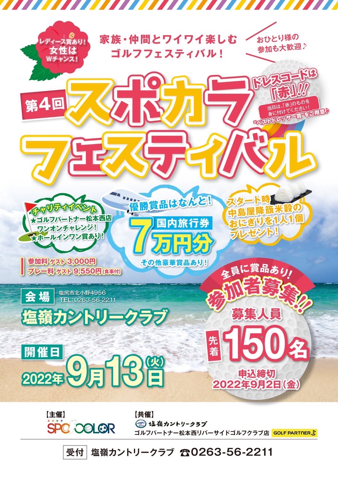 9月13日(火)7万円旅行券をGETせよ♪スポカラフェスティバル 2022年9月3日 いつも豪華賞品が揃うスポカラコンペ!! 今年もゴルフパートナー松本西店様ご協力によりますワンオンチャレンジ・チャリティイベ ントも同時開催!! 参加者どしどし応募中です!今年のBIGな賞品をGETするのはアナタです!!